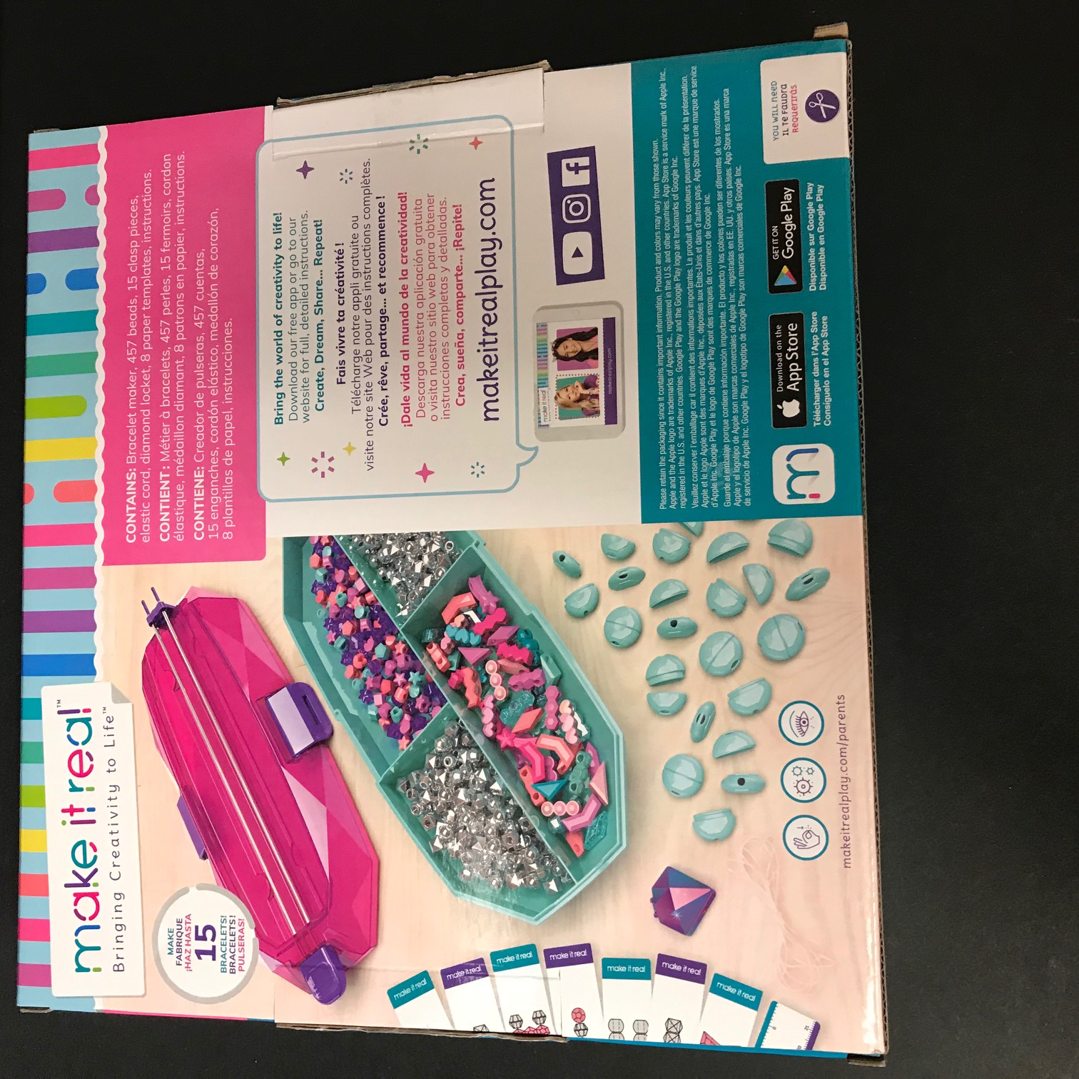It opens up to clasp pieces 411 beads a diamond locket 8 paper templates instructions and an amazing station that threads beads. Make It Real - Gem Links Bracelet maker. The Make It Real Gem Links Bracelet Maker features over 400 beads and heaps of other jewellery-making must-haves that lets kids make up to 12 shiny pieces of jewellery.